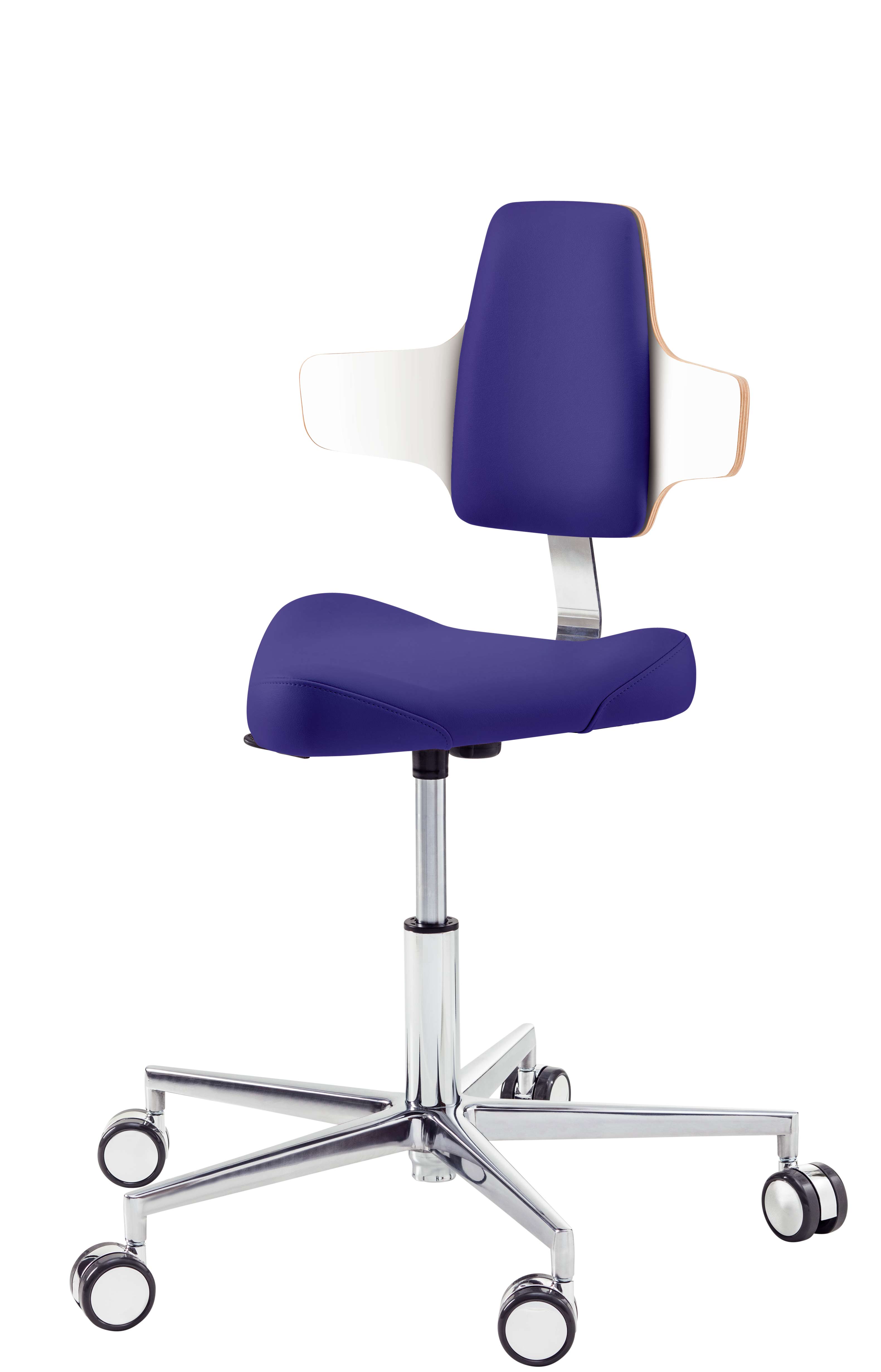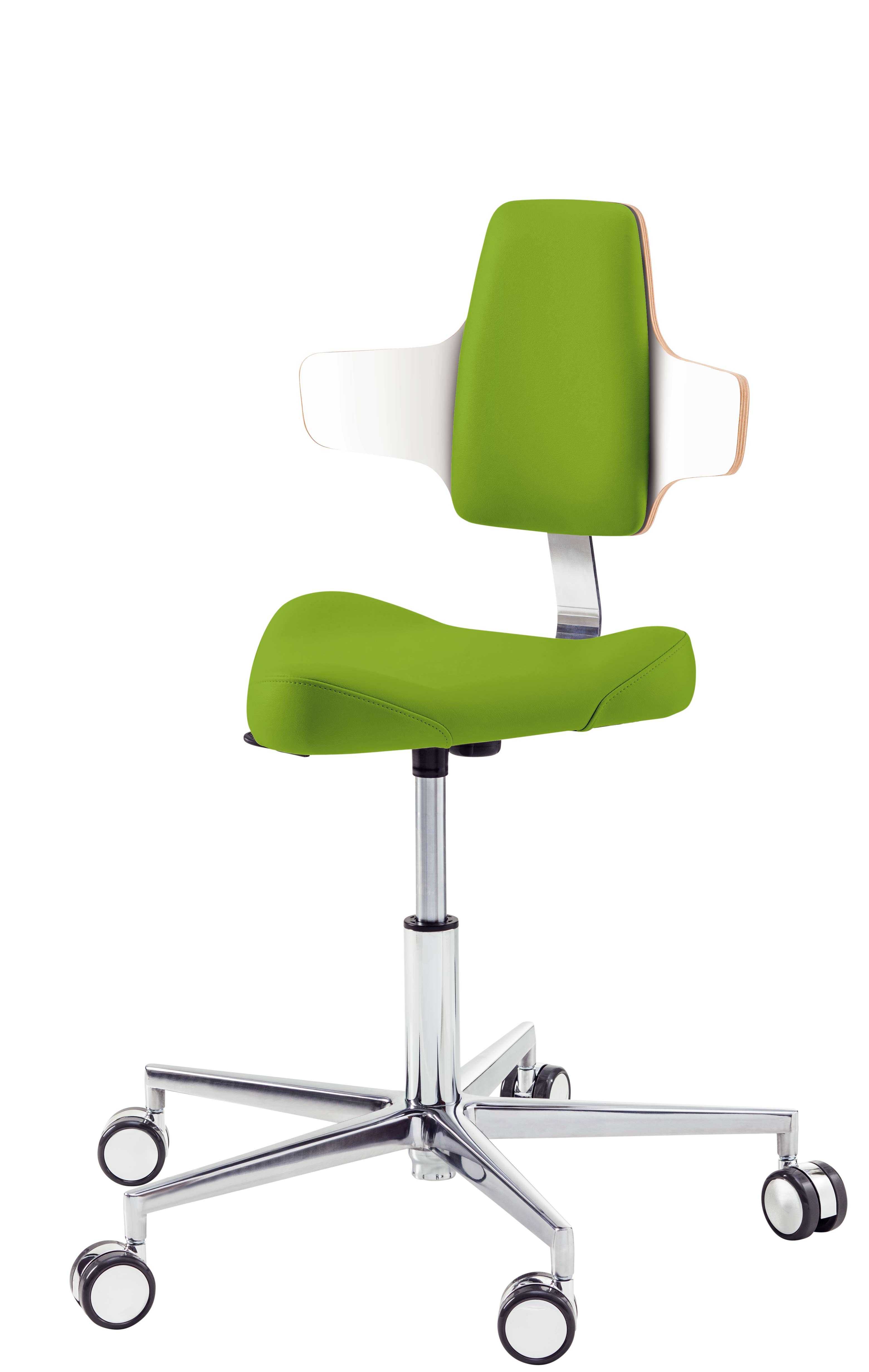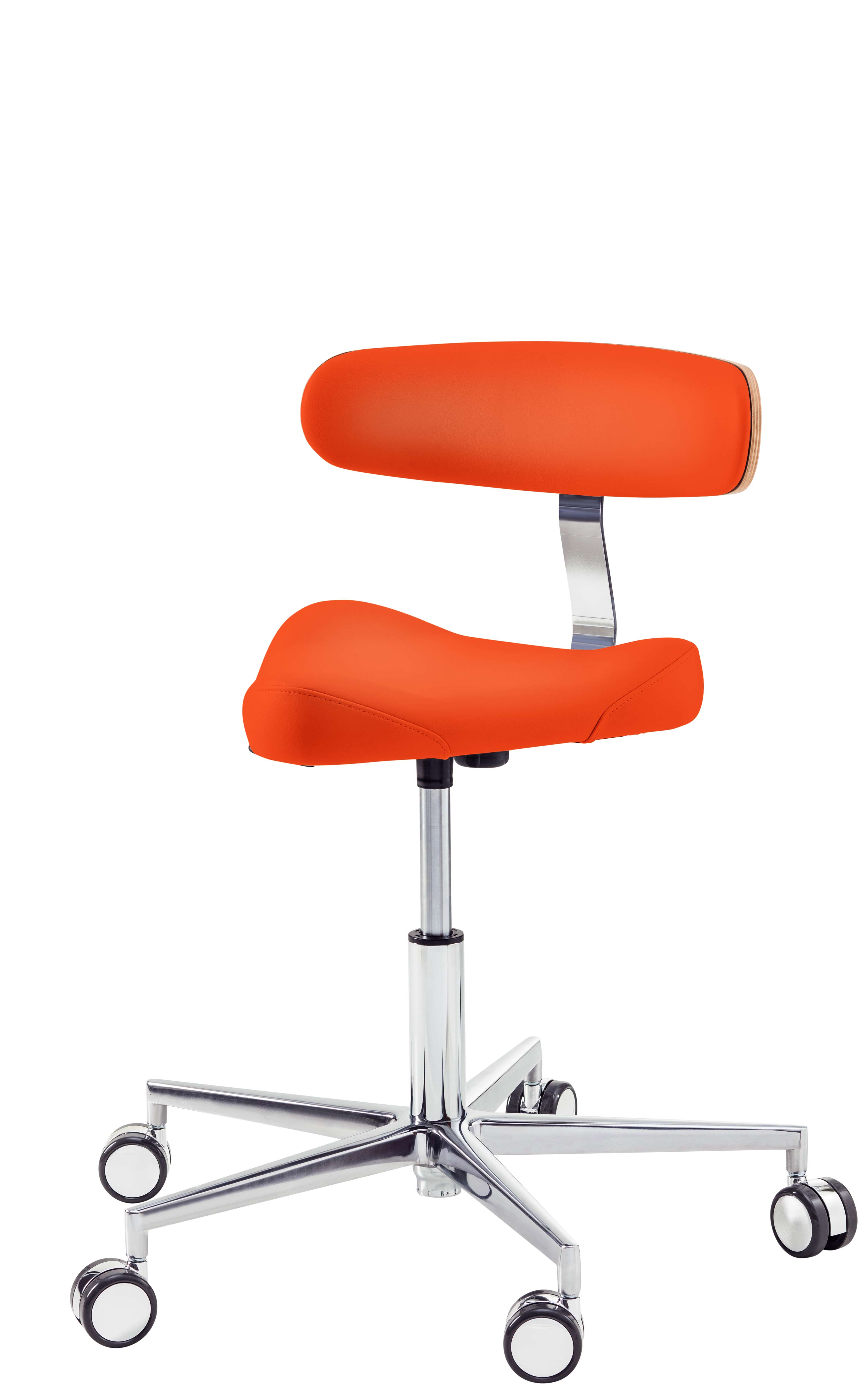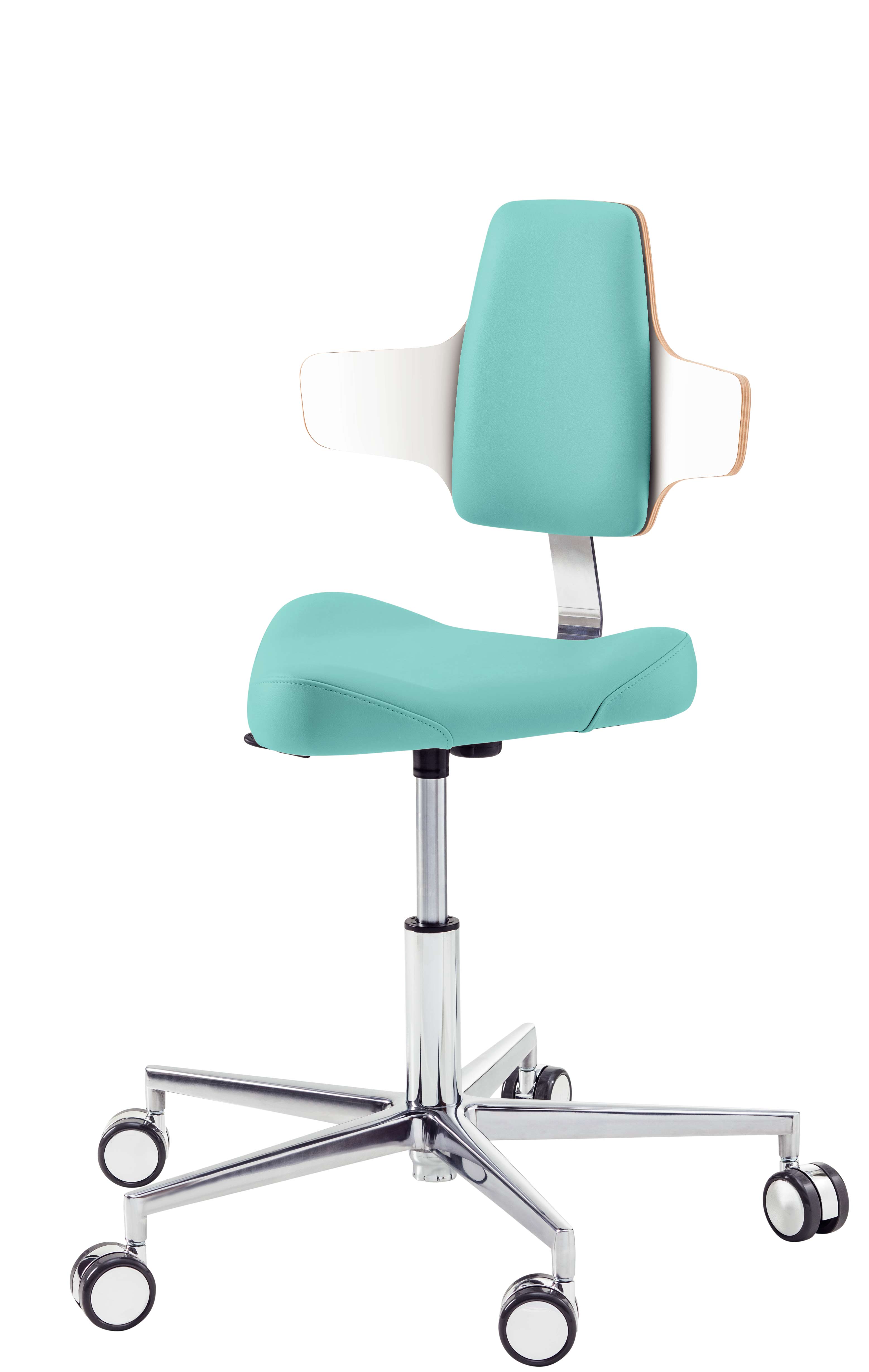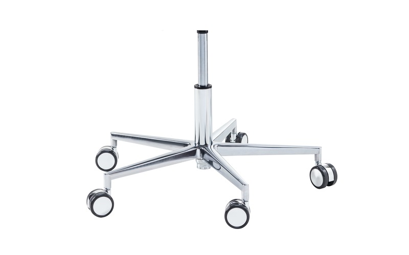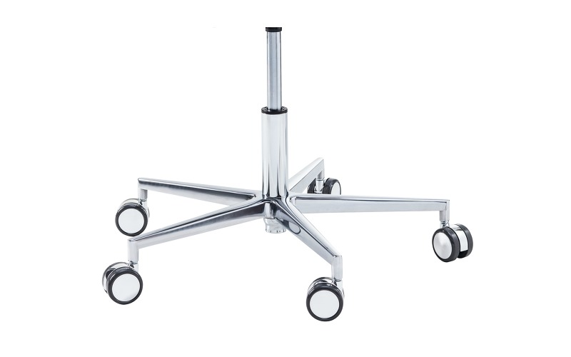 Треугольная форма сиденья обеспечивает свободу движений в области тазобедренного сустава. Прочная алюминиевая крестовина оснащена самоблокирующимися двойными колесиками, которые реагирует на вес специалиста, обеспечивая высокую мобильность стула во время работы и его надежную фиксацию на твердом полу при отсутствии нагрузки. Изменение высоты – пневматическое, с рычажным механизмом управления, в диапазоне: